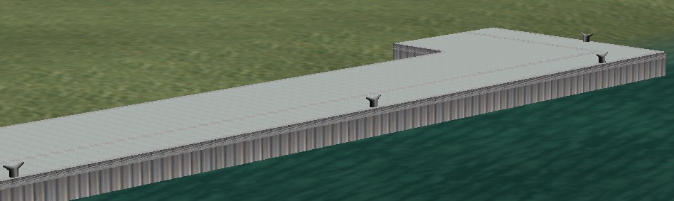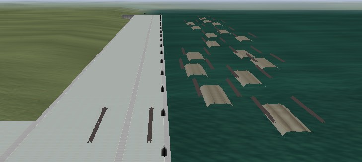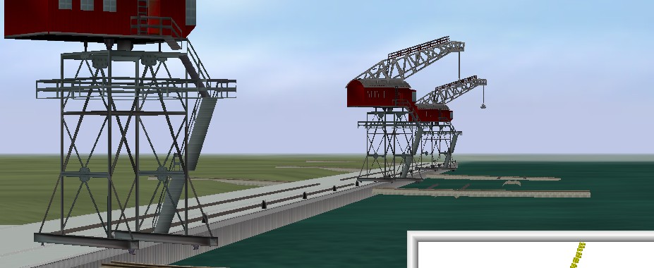 Jetzt habe ich die ungefähre Anzahl der " AG1_Kran_Gleis30m " entlang der Kaimauer ins Wasser gelegt.