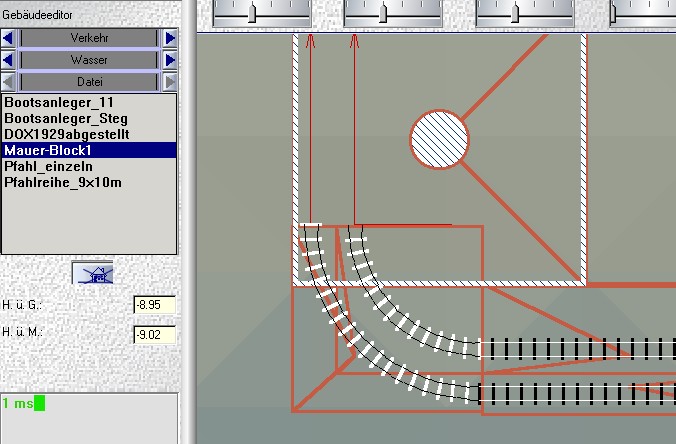 Der Abstand Gleis und Kaimauer ist jetzt so, das zwischen einem Schiff und Mauer ca. 0.4 m Zwischenraum sind.